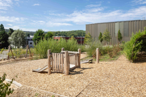 Les espaces ouverts aux alentours de l’école primaire de Dudelange sont caractérisés par des différences de hauteur dans la topographie allant jusqu’à 7m. Le principal élément de liaison entre les terrasses des cours de récréation supérieure et inférieure est un système d’escaliers et de rampes. Il donne accès à la cour de récréation supérieure pavée et aux terrasses de la cour de récréation proches de l’état naturel à des niveaux de hauteur très différents. Elles offrent la possibilité de bouger, de grimper, de se balancer et de glisser. En guise d’adaptation au changement climatique, il existe une zone séparée avec un bassin de collecte pour la rétention des eaux de pluie.